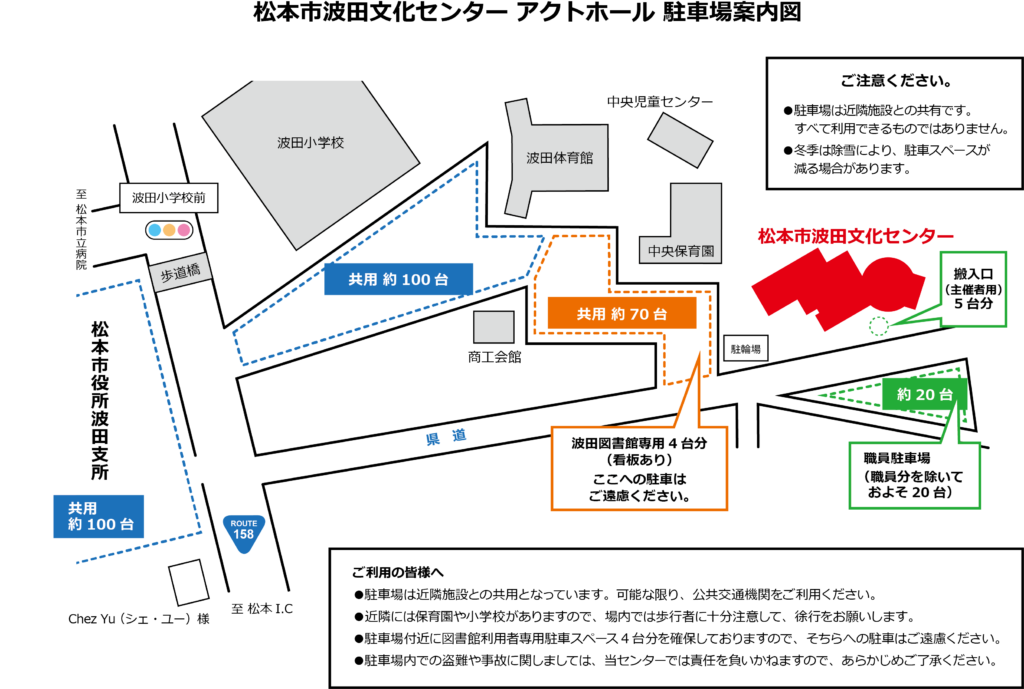 松本市波田文化センターと、隣接する中央保育園、波田体育館、波田小学校と共用の駐車場をご利用ください。