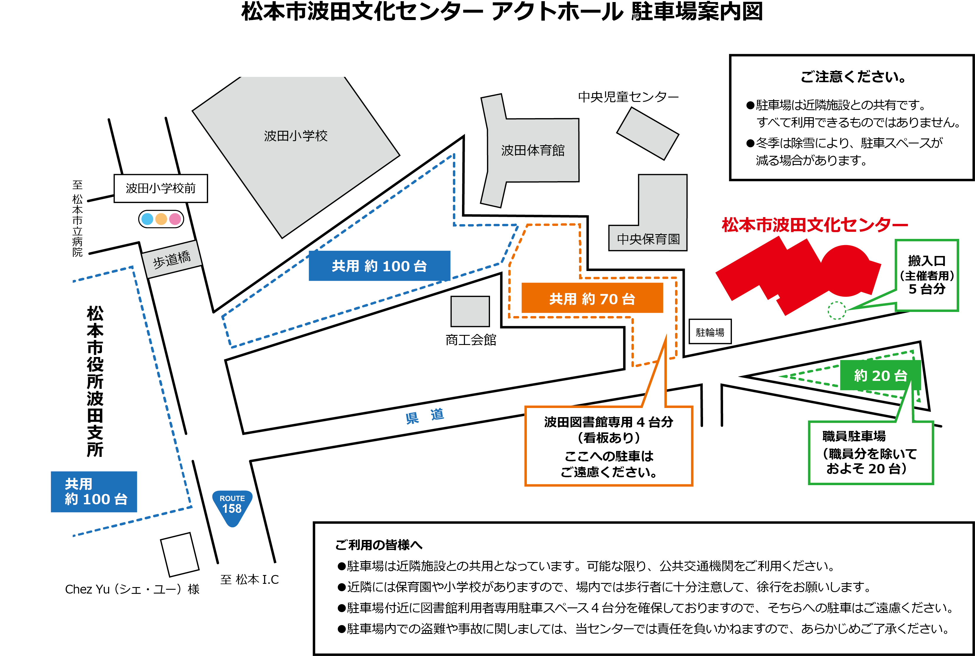 松本市波田文化センターと、隣接する中央保育園、波田体育館、波田小学校と共用の駐車場をご利用ください。